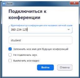 1. Запустите приложение Zoom и вставьте идентификатор конференции (номер конференции, присланный организатором) за несколько минут до начала занятия. В появившемся окне укажите имя и фамилию. Нажмите кнопку Войти.